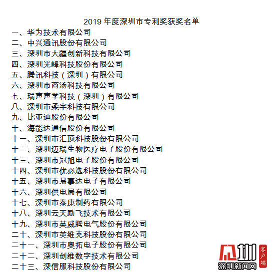 會議同期還發(fā)布了2019年度深圳市專利獎獲獎企業(yè)名單,華為技術(shù)有限公司、中興通訊股份有限公司、深圳市大疆創(chuàng)新科技有限公司、深圳光峰科技股份有限公司、騰訊科技(深圳)有限公司、深圳市商湯科技有限公司、瑞聲聲學科技(深圳)有限公司等23家單位獲獎。