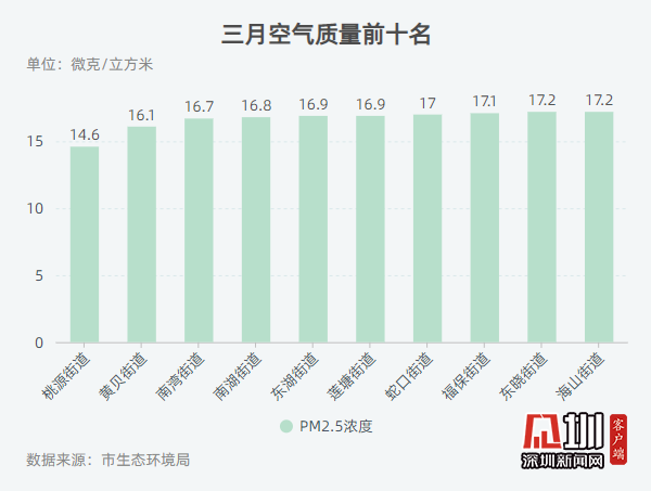 記者從深圳市生態(tài)環(huán)境局獲悉,2020年3月,全市74個街道PM2.5濃度在14.6-24.3微克/立方米之間,均值為19.0微克/立方米。