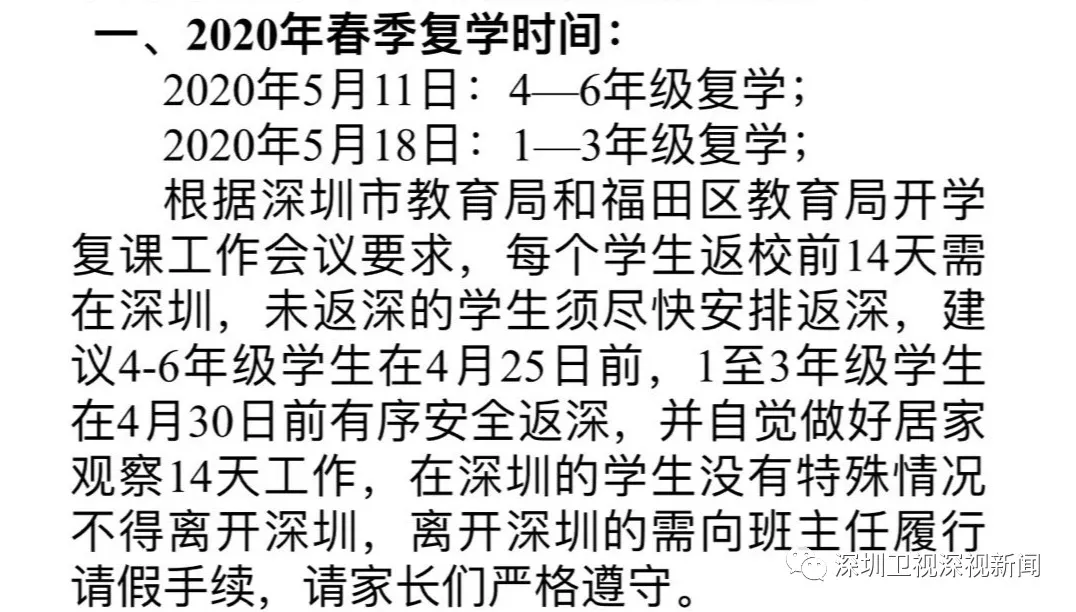 近日,有媒體報道稱,深圳中小學生返校時間已確定。5月11日安排全市高中、初中其他學段和小學4—6年級學生返校;5月18日安排全市小學1—3年級學生返校。