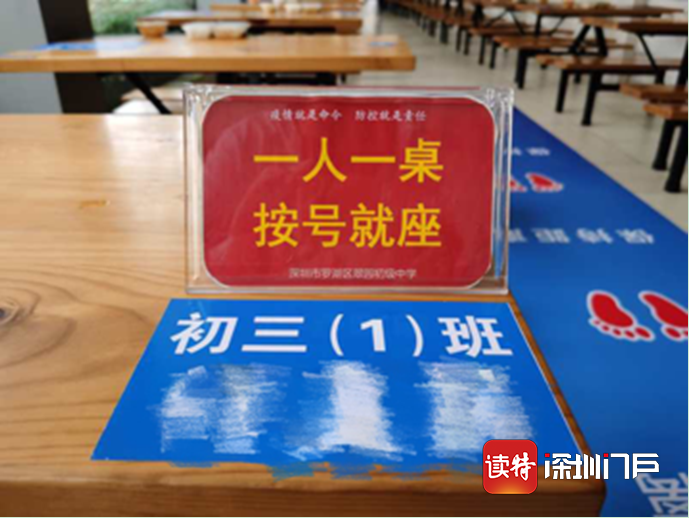 午餐期間,翠園初級中學(xué)在食堂的每張桌上貼有學(xué)生班級和姓名,一桌一人。就餐期間,學(xué)生有序就座。