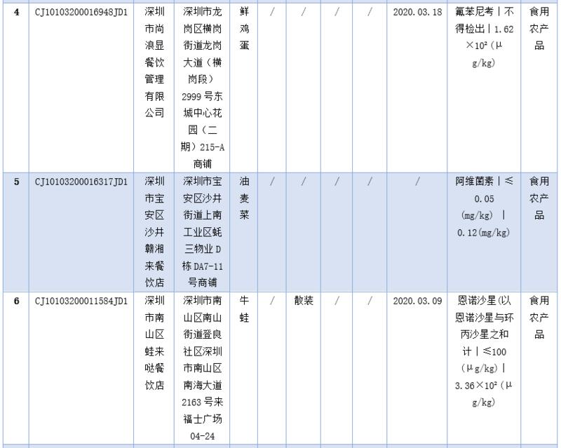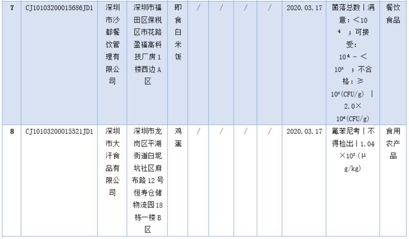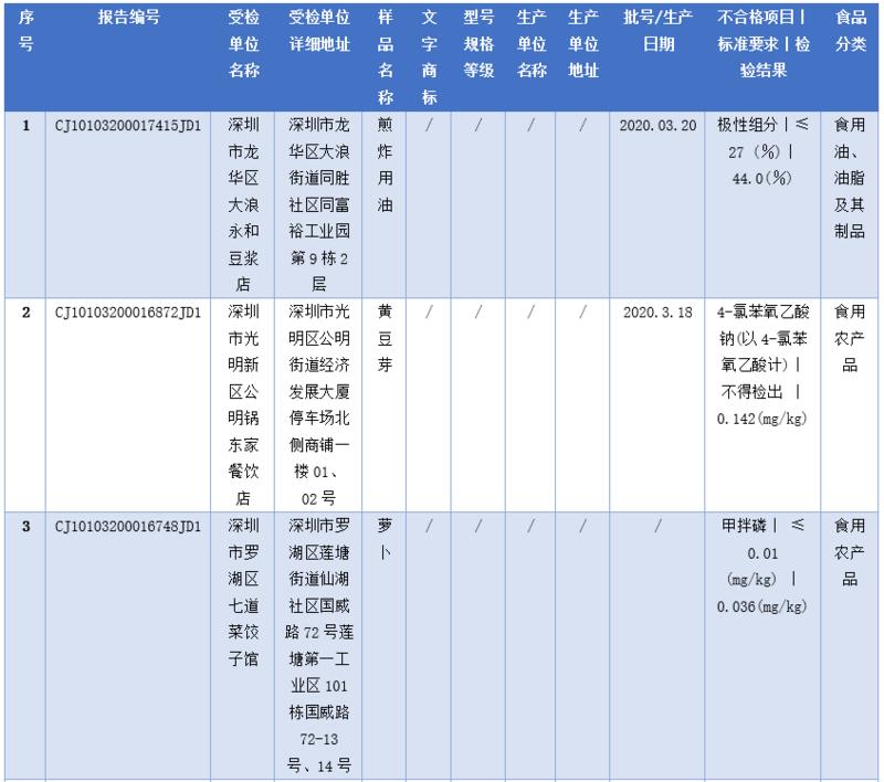 見圳客戶端·深圳新聞網(wǎng)2020年5月1日訊(深圳特區(qū)報記者 楊德琦)4月30日,深圳市市場監(jiān)督管理局發(fā)布第十四期食品安全抽樣檢驗情況通報,3月共抽檢餐飲環(huán)節(jié)食品1009批次,涉及餐飲環(huán)節(jié)經(jīng)營主體919家次,共檢測食品指標(biāo)6347項次。其中不合格樣品8批次,涉及不合格食品類別有食用農(nóng)產(chǎn)品6批次,黃豆芽、蘿卜、雞蛋、油麥菜、牛蛙等在列;餐飲食品1批次,為即食白米飯;食用油、油脂及其制品1批次,為煎炸用油。涉及不合格項目類別為獸藥殘留、農(nóng)藥殘留、非食用物質(zhì)、微生物污染、品質(zhì)指標(biāo)。
