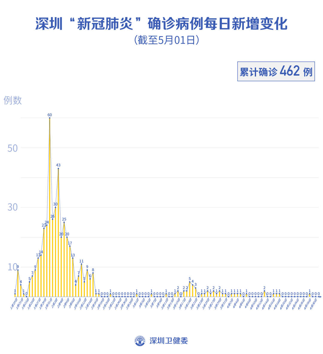 截至5月1日24時,深圳累計報告新冠肺炎病例462例。