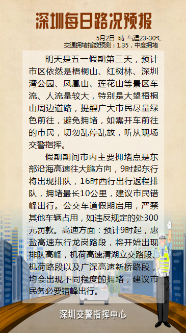 由于市民出行意愿較強烈,預計明日市內(nèi)熱門商圈、景區(qū)、公園的車流量壓力仍較大,大鵬、鹽田等濱海景區(qū)車流量將會持續(xù)增加。
