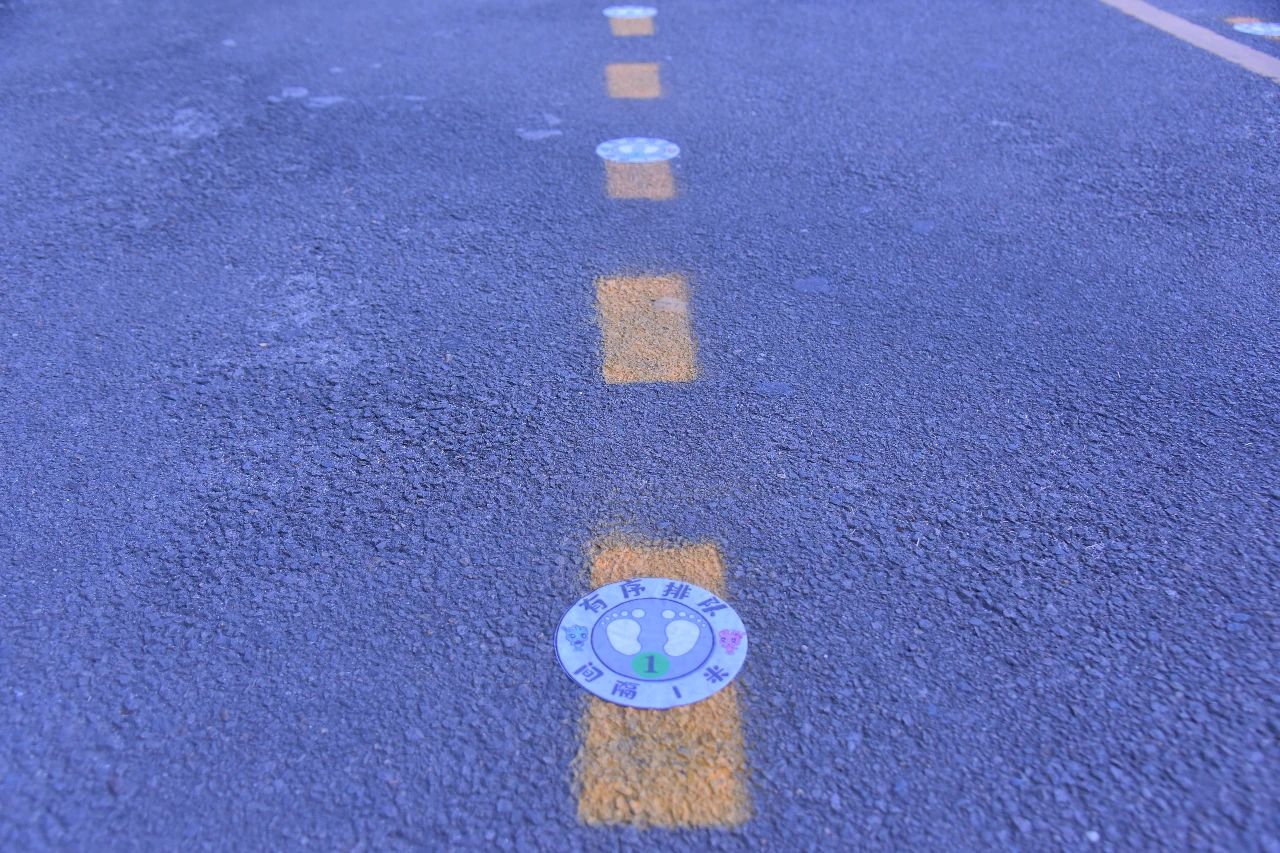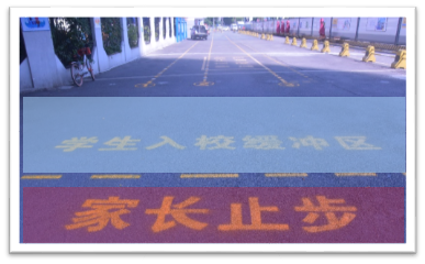 校門口還設置了,入校緩沖區(qū),家長止步區(qū),三色地貼!請家長們止步!孩子們可以循著地貼,走向屬于自己的色彩通道!