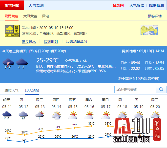 見圳客戶端·深圳新聞網2020年05月10日訊 在外面的朋友們注意了,大風大雨馬上到貨!據深圳市氣象臺消息,深圳市氣象臺于2020年05月10日15時15分在全市發(fā)布暴雨黃色、大風藍色預警,預計16-17時全市自西北向東南將出現20-40毫米降水,并伴有8級左右短時大風。