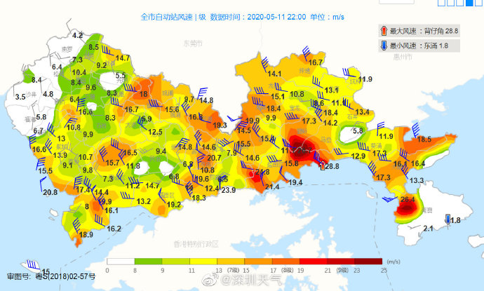 22時(shí)18分:過(guò)去1小時(shí)深圳市最大陣風(fēng)達(dá)到10-11級(jí),出現(xiàn)在鹽田和大鵬南澳地區(qū)。