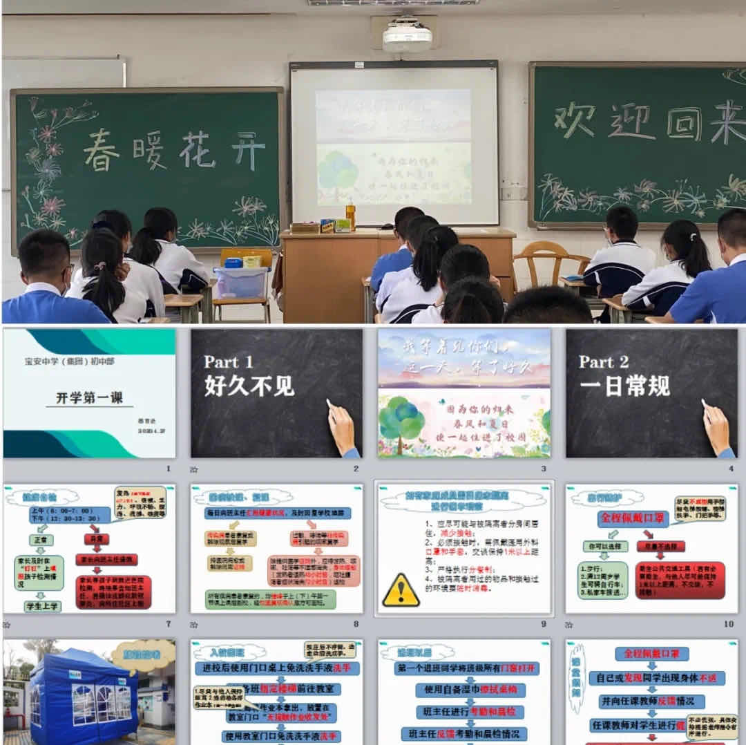 學校在校門外設(shè)立進入通道,讓學生按照提前設(shè)置好的路線指引, 分批分流 進入校園。學校課室的課桌擺放呈“一人一桌”制,樓道貼上站位地標,充分拉開學生安全間距離, 少交談少聚集 。除此之外,學校通過取消課間操、眼操等方式壓縮課間,實現(xiàn) 錯峰放學 。各班門前設(shè)置無接觸交作業(yè)區(qū),放置免洗洗手液,另外還特地為學生發(fā)放常規(guī)指引小冊子,制作了《寶安中學(集團)2020年春季學期返校復學指引》手繪視頻,開設(shè)了以防疫為主要內(nèi)容的“開學第一課”,讓防疫知識 入耳入腦入心 。