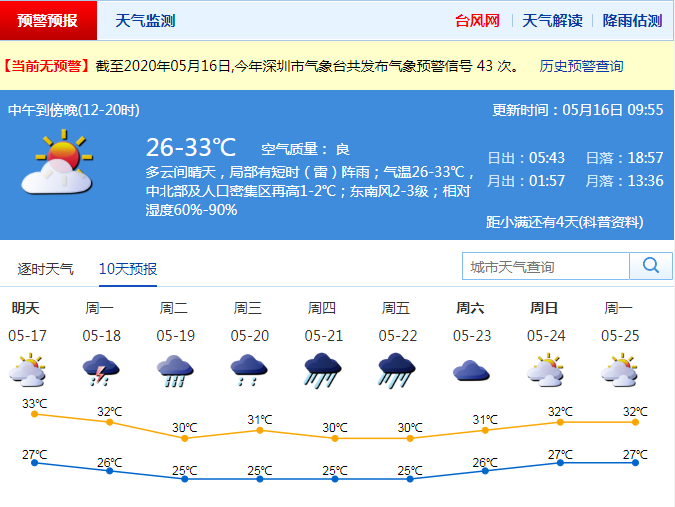 見圳客戶端·深圳新聞網(wǎng)2020年5月16日訊 深圳市氣象臺預(yù)報,周末天氣悶熱局部有短時(雷)陣雨下周轉(zhuǎn)趨多降雨天氣:周末期間(16-17日)多云間晴天,天氣悶熱,局部地區(qū)有短時(雷)陣雨,氣溫27-33℃,中北部最高氣溫可達35℃左右;下周轉(zhuǎn)趨多降雨天氣,其中18-19日有中到大雨局部暴雨,伴有短時強降雨、短時大風。