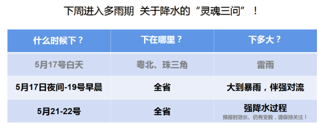 17日夜間到19日早晨,珠三角、粵東和陽江、茂名有大雨到暴雨,其余市縣有大雨局部暴雨;雷雨時伴有8級左右的短時大風(fēng)。