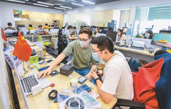 走進(jìn)工場(chǎng),生機(jī)與活力撲面而來。位于19樓東南角的舒糖訊息科技(深圳)有限公司CEO何耀威,正在調(diào)試一款形似智能手表的血糖測(cè)試儀。這款通過最新的光譜技術(shù)及心電圖技術(shù),將血糖指數(shù)通過藍(lán)牙快速傳輸?shù)绞謾C(jī)上,實(shí)現(xiàn)無創(chuàng)監(jiān)測(cè)的儀器,如今正逐步投放市場(chǎng)。