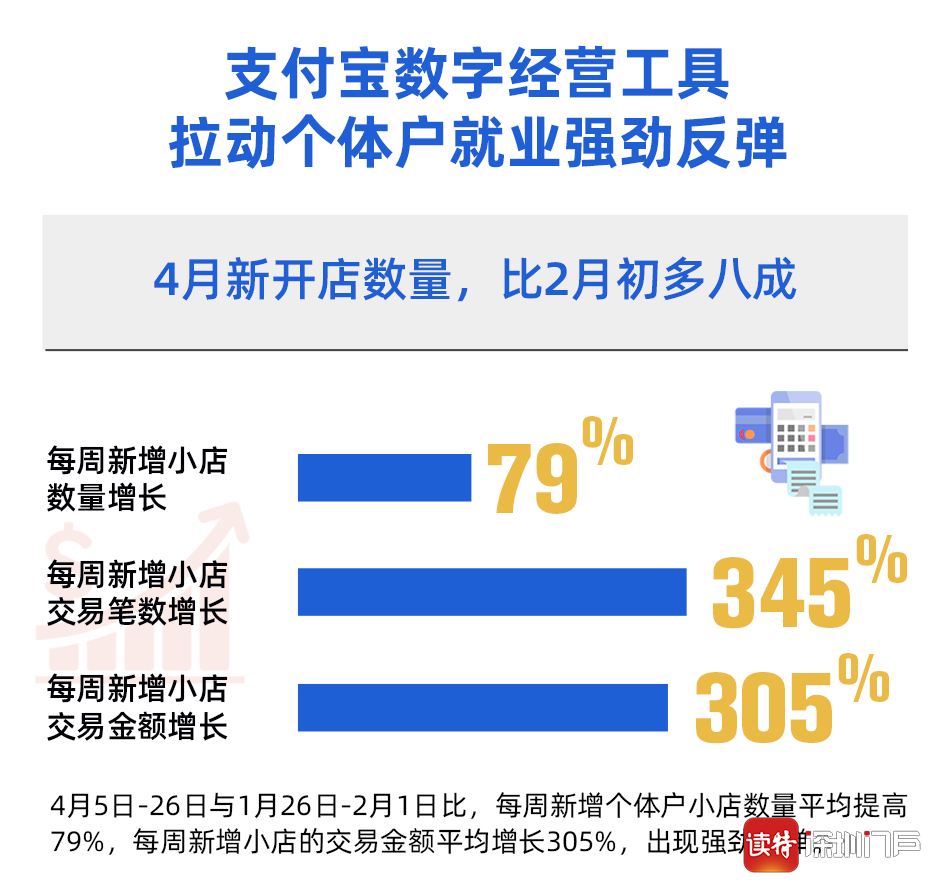 北京大學(xué)數(shù)字金融研究中心通過(guò)分析支付寶最新數(shù)據(jù)發(fā)現(xiàn),與疫情中最低點(diǎn)相比,全國(guó)個(gè)體戶(hù)就業(yè)形勢(shì)已出現(xiàn)強(qiáng)勁反彈:隨著復(fù)工復(fù)產(chǎn)的全面推進(jìn)和消費(fèi)券的發(fā)放,4月以來(lái)與疫情最低點(diǎn)2月1日當(dāng)周相比,每周新增個(gè)體戶(hù)小店數(shù)量平均提高79%,每周新增小店的交易金額平均增長(zhǎng)305%。