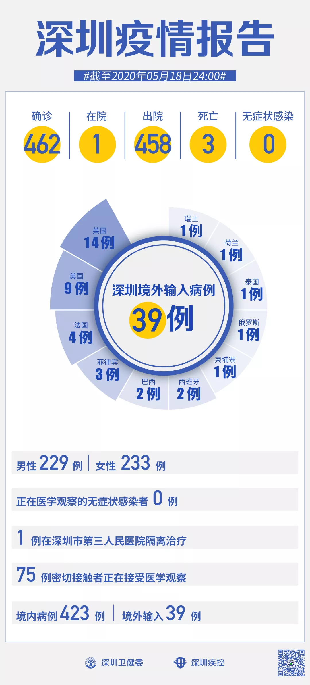 截至5月18日24時(shí),深圳累計(jì)報(bào)告新冠肺炎病例462例。