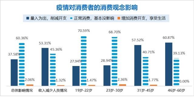 調(diào)研發(fā)現(xiàn),在疫情影響下,60.36%消費者選擇正常消費,37.58%的消費者選擇量入為出,削減開支;而受疫情影響收入下降的受訪者中,大部分人選擇“削減開支”,增加消費支出的僅占2.06%。
