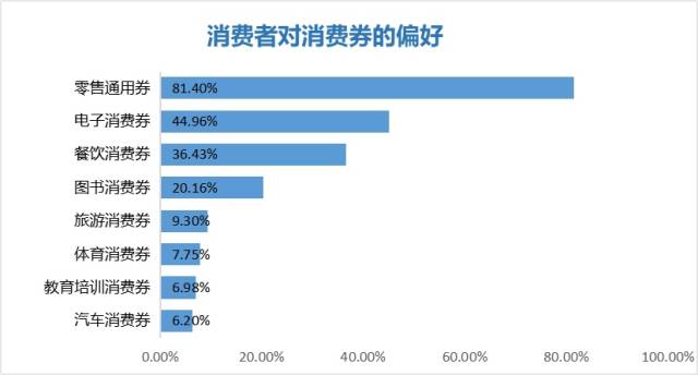 調(diào)研發(fā)現(xiàn),消費券對于促進(jìn)消費有較大作用。42%的消費者希望拿到消費券,47%的消費者持中立態(tài)度,但表示如果得到了消費券的話更愿意主動去消費。在各種類型的消費券中,消費者喜歡的前三種類型分別是零售通用券、電子消費券和餐飲消費券,消費者選擇的占比分別為81.40%、44.96%和36.43%。
