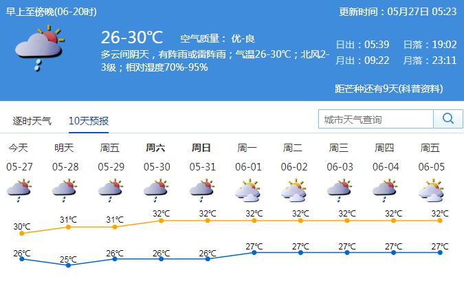 市氣象臺預(yù)測,27日-31日多云天氣為主,部分時間有陣雨或雷陣雨,氣溫逐日升高,天氣轉(zhuǎn)熱。27日多云間陰天,有陣雨或雷陣雨;氣溫26-30℃;北風2-3級;相對濕度70%-95%。28-31日多云,可見陽光,部分時間有(雷)陣雨。6月1-2日多云,局地有短時陣雨。