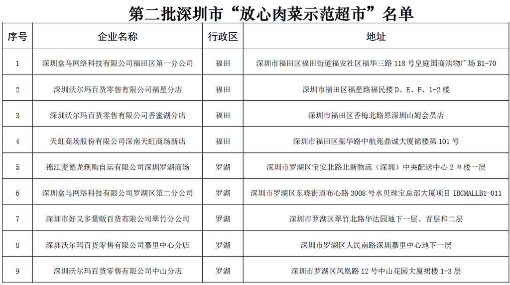 見(jiàn)圳客戶端?深圳新聞網(wǎng)2020年5月29日訊(見(jiàn)圳客戶端、深圳新聞網(wǎng)記者 劉夢(mèng)婷 見(jiàn)習(xí)記者 唐麗玲)日前,深圳市市場(chǎng)監(jiān)督管理局(以下簡(jiǎn)稱“深圳市監(jiān)局”)公布了2020年度第二批深圳市“放心肉菜示范超市”名單,盒馬、沃爾瑪、天虹等27家在深分店榜上有名。