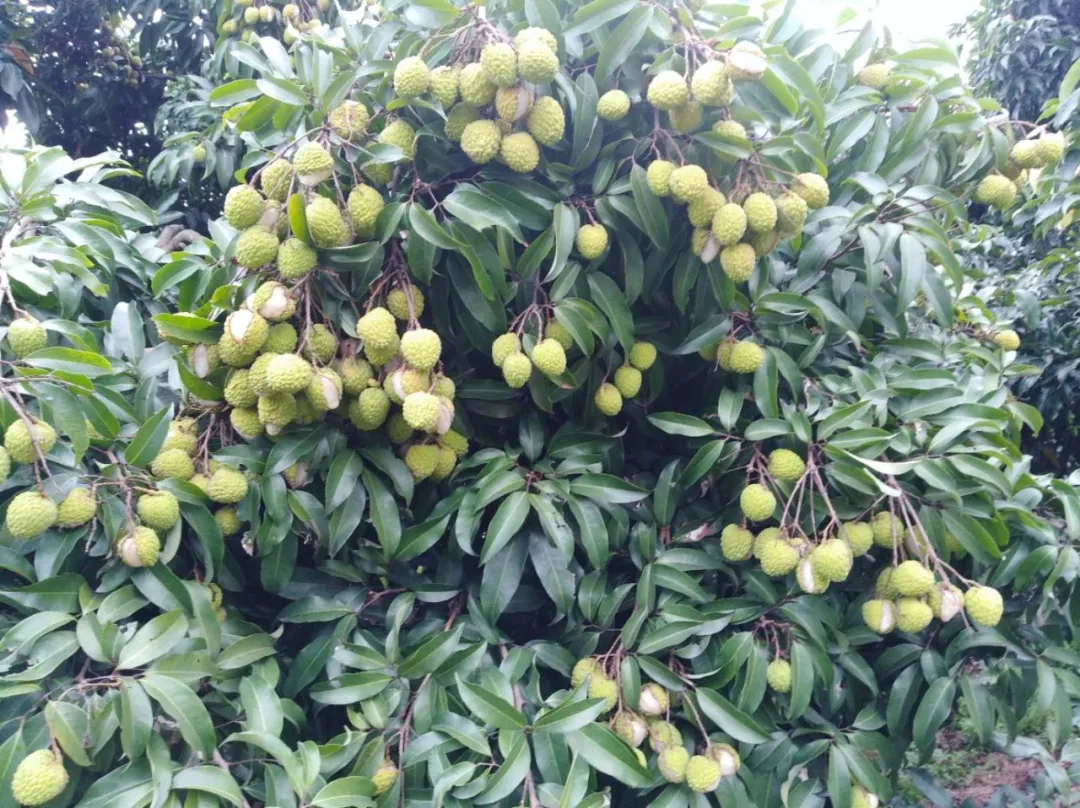 不遠處的另一片果地里,是另一番景象。枝頭上,糯米糍、桂味一片青綠,爆裂的糯米糍散落一地。