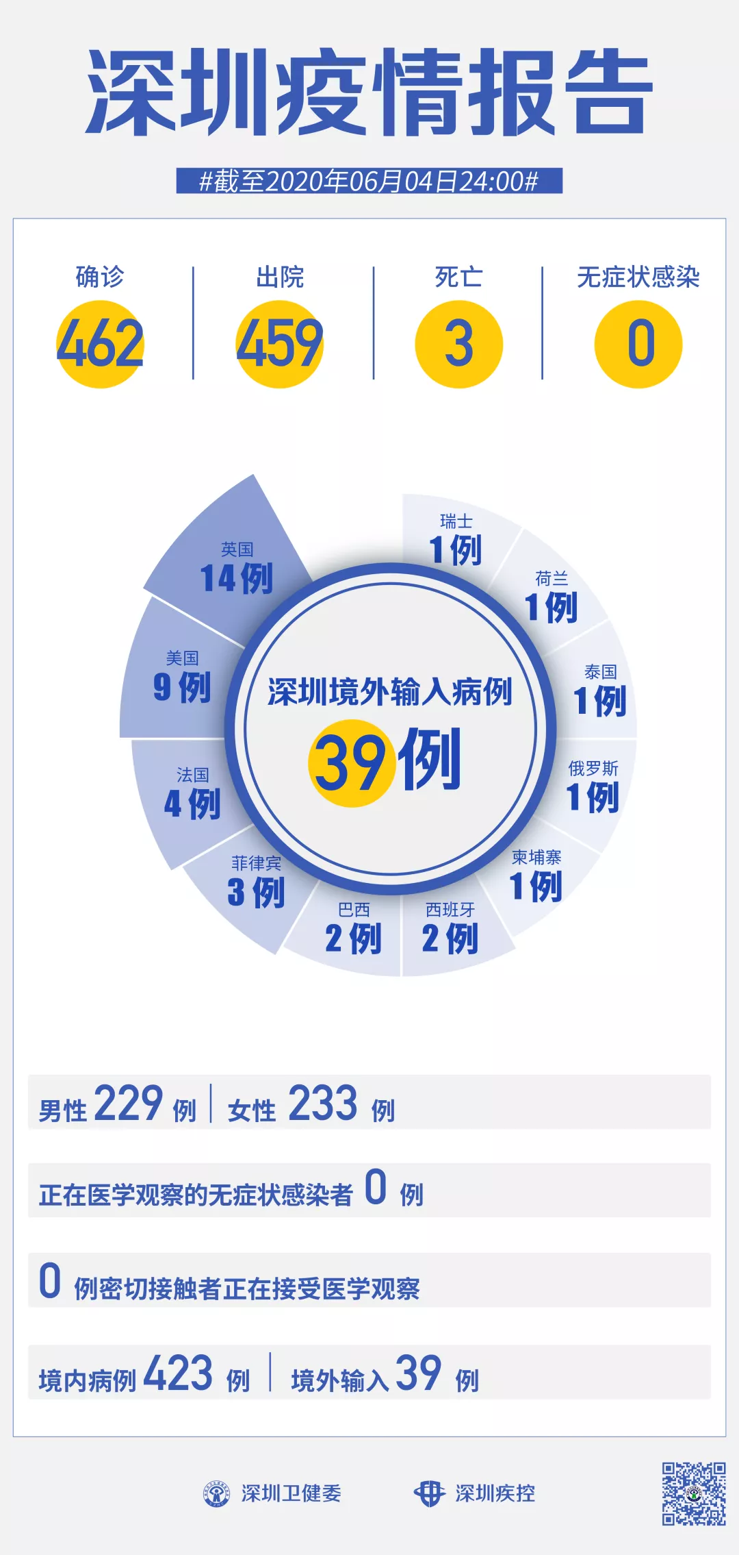 截至6月4日24時,深圳累計報告新冠肺炎病例462例。