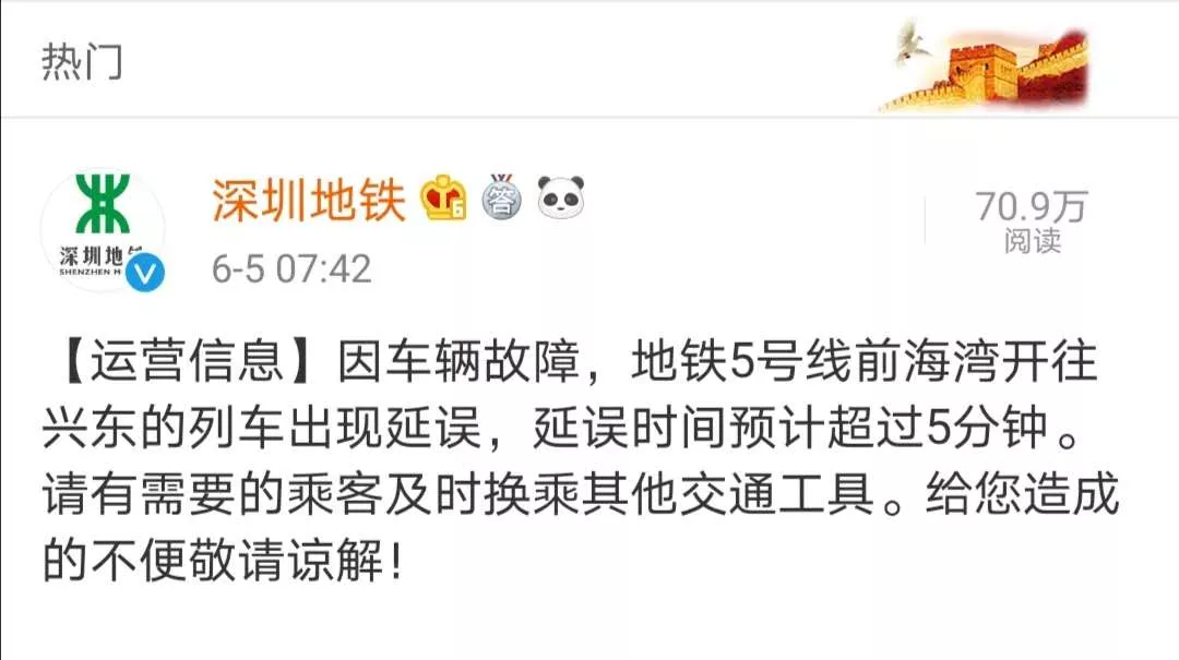 見圳客戶端·深圳新聞網(wǎng)2020年6月5日訊 今早7點(diǎn)42分深圳地鐵官方微博發(fā)布公告:因車輛故障,地鐵5號(hào)線前海灣開往興東的列車出現(xiàn)延誤,延誤時(shí)間預(yù)計(jì)超過5分鐘。