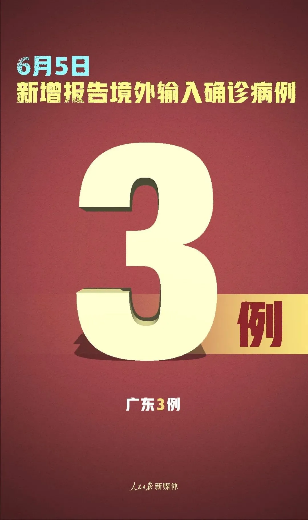 6月5日0-24時,31個省(自治區(qū)、直轄市)和新疆生產(chǎn)建設(shè)兵團(tuán)報告新增確診病例3例,均為境外輸入病例(廣東3例);無新增死亡病例;新增疑似病例1例,為境外輸入病例(上海1例)。
