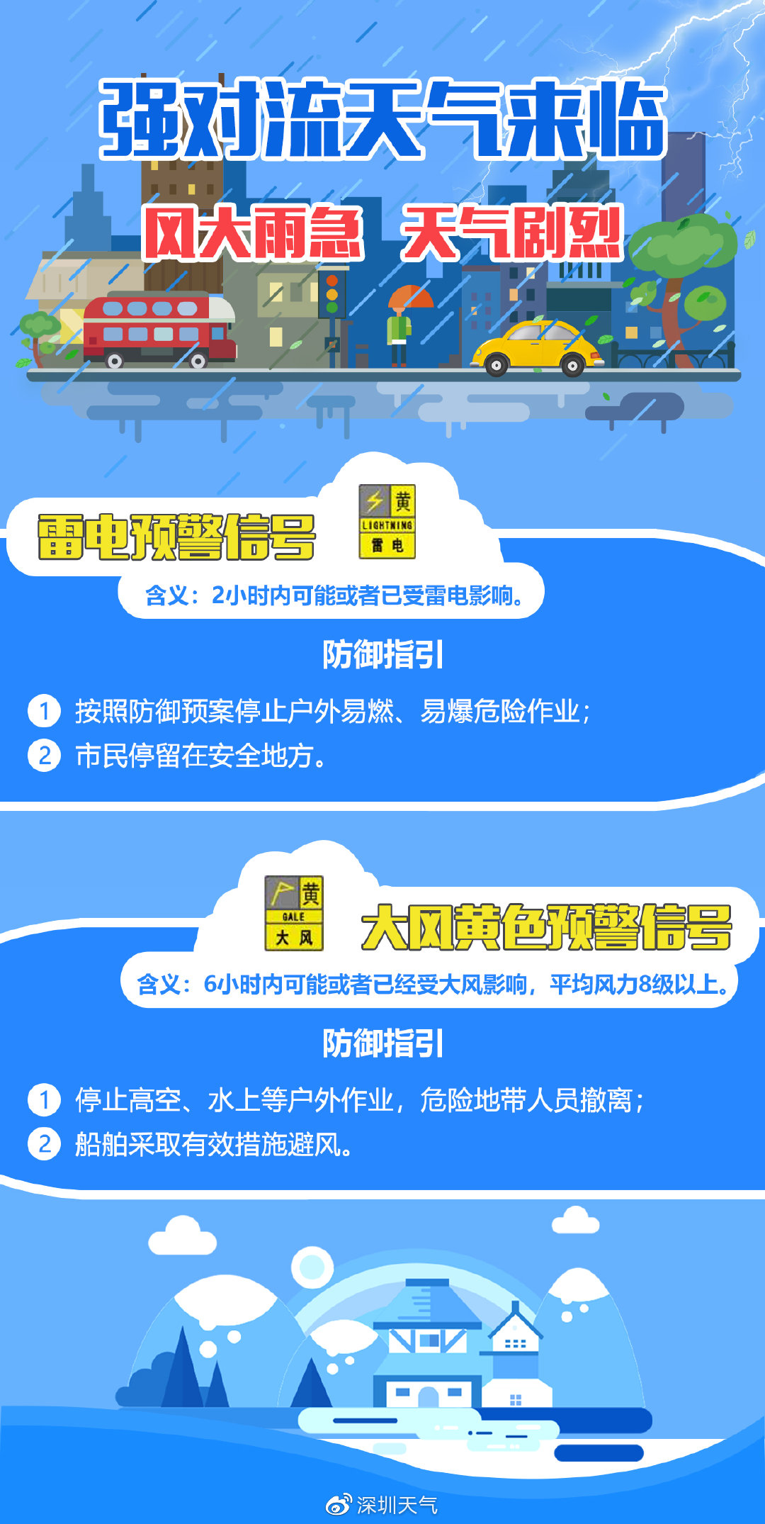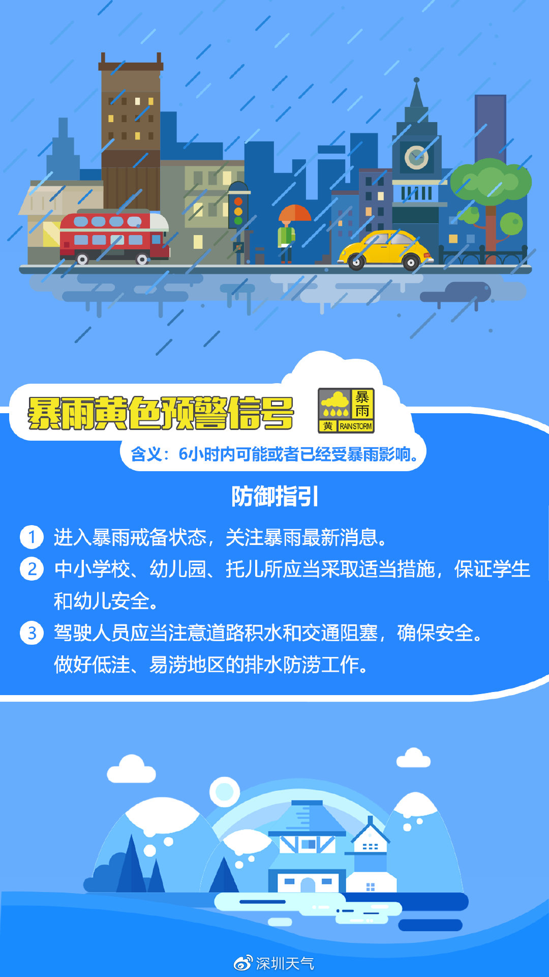 據(jù)深圳天氣微博消息,過去1小時,大鵬新區(qū)和東部海區(qū)累計雨量已達暴雨,預(yù)計強降雨還將持續(xù)2-3小時,全市進入暴雨防御狀態(tài),請注意防御。中小學(xué)、幼兒園可視情況推遲上學(xué)。同時暴雨黃色分區(qū)、大風(fēng)黃色、雷電預(yù)警正在生效中,請注意做好防御。