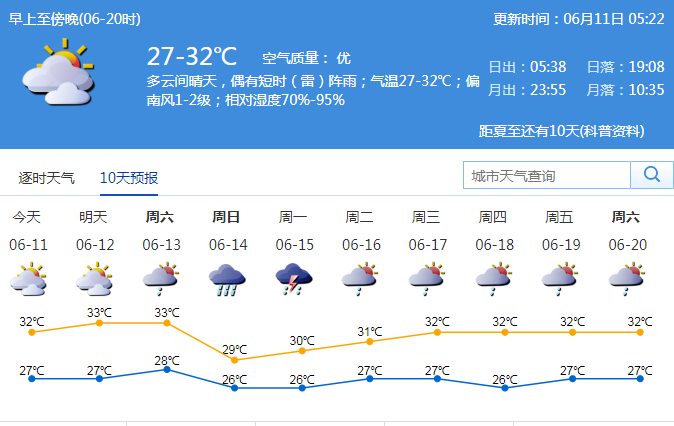 市氣象臺(tái)預(yù)測(cè),11-13日多云到晴天,偶有局地短時(shí)(雷)陣雨,天氣悶熱,11日氣溫27-32℃;展望14-15日有一次降雨過(guò)程。