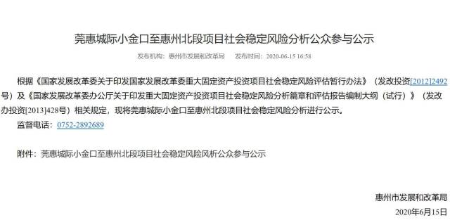 6月15日下午,惠州市發(fā)改局發(fā)布《莞惠城際小金口至惠州北段項(xiàng)目社會(huì)穩(wěn)定風(fēng)險(xiǎn)分析公眾參與公示》,征求公眾對(duì)項(xiàng)目建設(shè)的意見和建議。