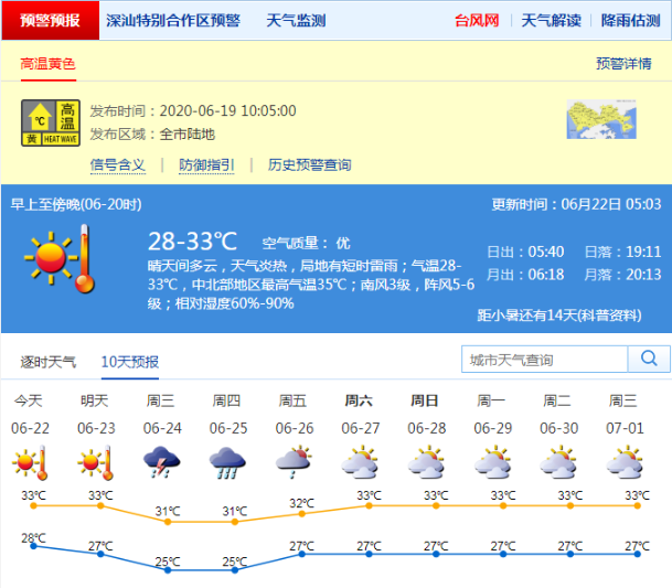 見(jiàn)圳客戶端?深圳新聞網(wǎng)2020年6月22日訊 據(jù)深圳氣象局消息,6月22日,深圳晴天間多云,天氣炎熱,局地有短時(shí)雷雨;氣溫28-33℃,中北部地區(qū)最高氣溫35℃;南風(fēng)3級(jí),陣風(fēng)5-6級(jí);相對(duì)濕度60%-90%。