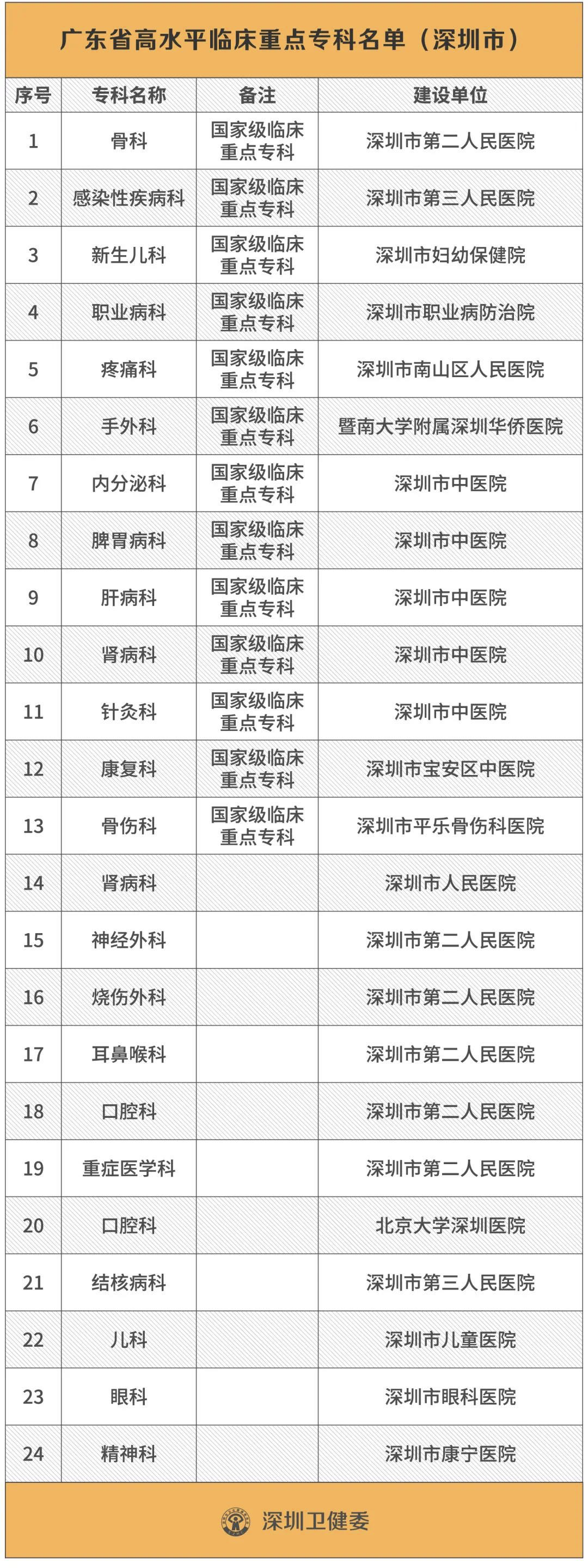 那是因為它們在另一份“省重點”名單上。這就是2019年由廣東省衛(wèi)健委公布的“廣東省高水平臨床重點專科”名單。深圳一共有24個??迫脒x,其中13個是國家衛(wèi)健委或國家中醫(yī)藥管理局認定的國家級臨床重點專科。