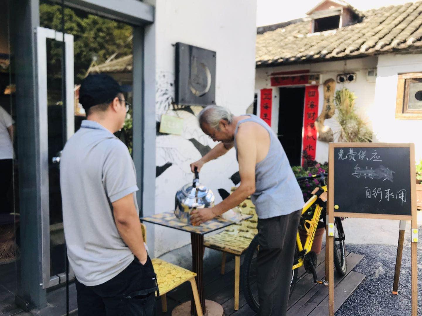 一張桌子、兩把椅子、一壺水就是一個(gè)涼茶點(diǎn),一旁支起的黑板上還寫著“免費(fèi)供應(yīng)、自行取用”八個(gè)字。這里的涼茶從下午三點(diǎn)半開(kāi)始準(zhǔn)時(shí)向過(guò)往行人免費(fèi)提供,一直到晚上七八點(diǎn)。愛(ài)心涼茶供應(yīng)點(diǎn)的發(fā)起人叫陳小林,熟悉他的人都稱呼他小林哥。