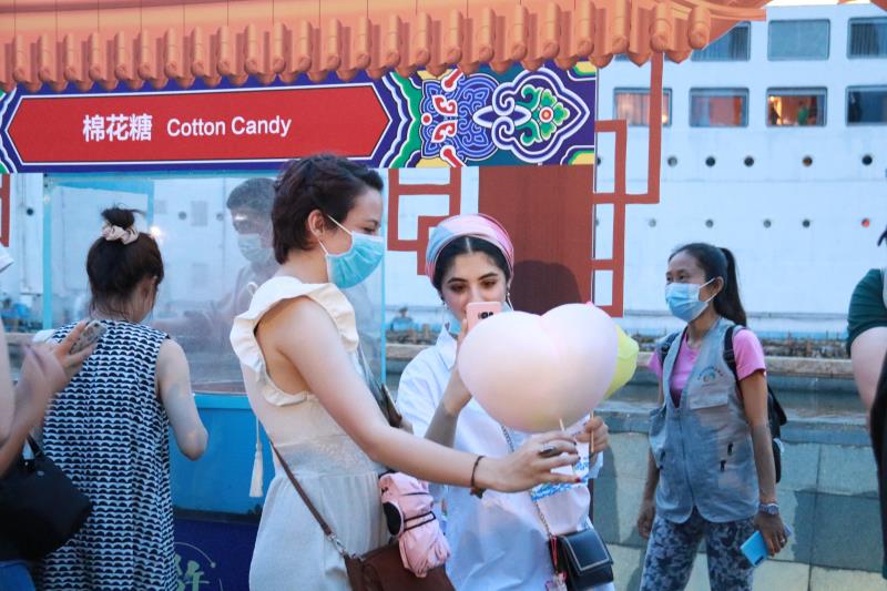 記者在現(xiàn)場看到,現(xiàn)場設置了糖畫、剪影、捏面人、皮影戲等中國傳統(tǒng)民俗攤位,不少居民有序排隊參與。活動中,居民領取圖鑒在每個攤位完成打卡,還可以現(xiàn)場試穿漢服。場外的大唐不倒翁表演也吸引了眾人目光。精心打扮的不倒翁小姐姐隨風搖曳,與圍觀群眾打招呼,場面好不熱鬧。民樂團現(xiàn)場演奏的《春江花月夜》《彩云追月》等民樂,更令活動增添幾分傳統(tǒng)風韻。
