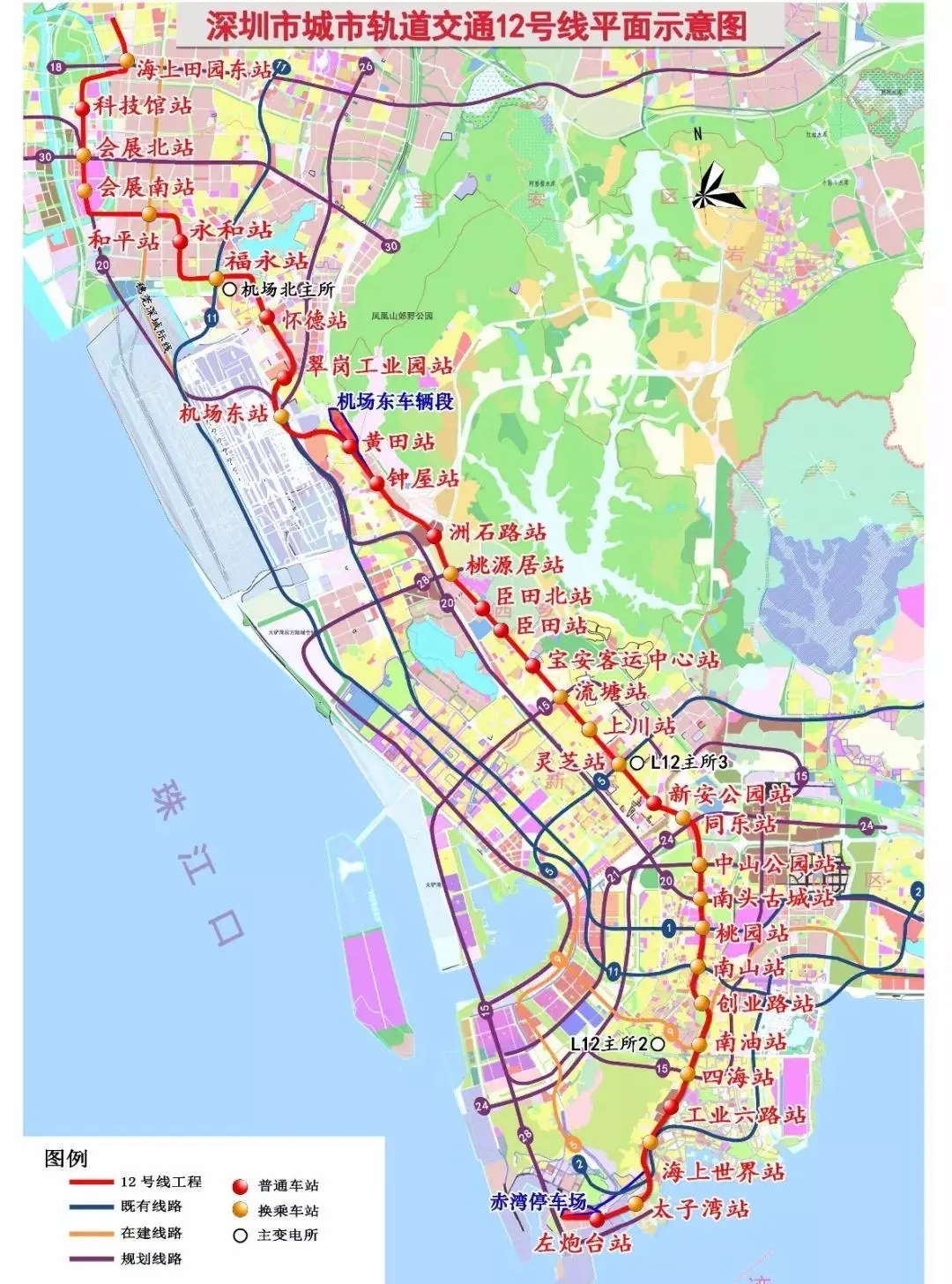 左炮臺-太子灣-海上世界(換乘2)-工業(yè)六路-四海-南油-創(chuàng)業(yè)路-南山(換乘11)-桃園(換乘1)-南頭古城-中山公園-同樂-寶安中學(xué)-靈芝(換乘5)-上川-流塘-寶安客運(yùn)中心-臣田南-臣田北-桃源居-洲石路-凱成二路-黃田-機(jī)場東(換乘1)-翠崗工業(yè)園-懷德-福永(換乘11)-同富-和平-會展南-會展北-科技館-海上田園東