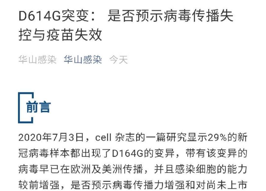 張文宏稱(chēng),特別是在7月3日,國(guó)際著名雜志《細(xì)胞》發(fā)表文章顯示,29%的新冠病毒樣本出現(xiàn)了D164G的變異,此次北京疫情反彈中發(fā)現(xiàn)的病毒株也有這個(gè)突變。