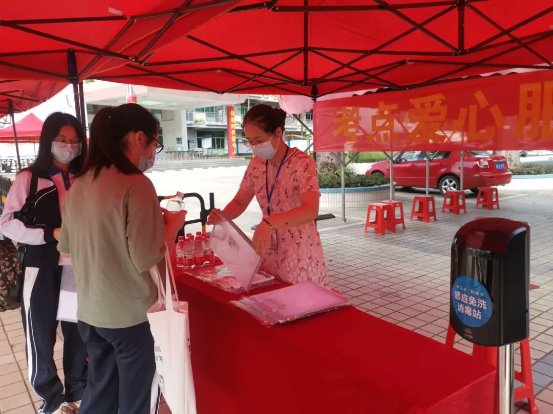 在現(xiàn)場(chǎng),學(xué)校設(shè)有考點(diǎn)愛(ài)心服務(wù)站,為學(xué)生提供文件袋、口罩、礦泉水等物品。學(xué)校老師對(duì)前來(lái)領(lǐng)物資的學(xué)生說(shuō):“加油,祝你們考試順利!”