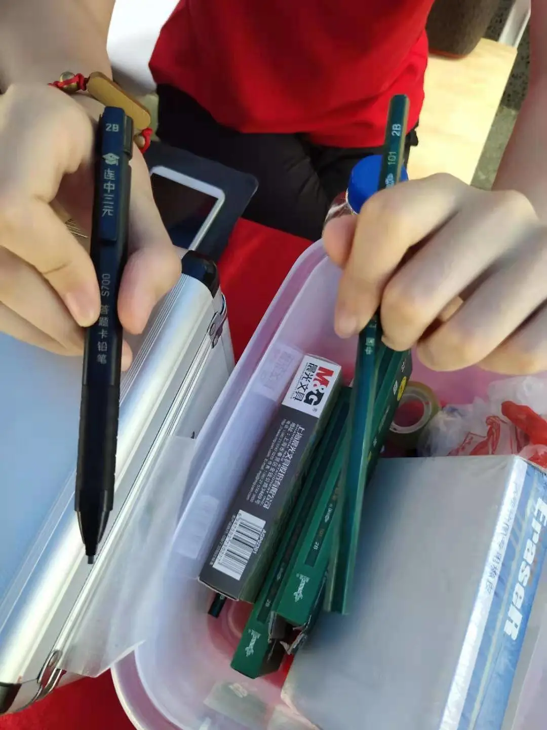 考生服務(wù)站的志愿者告訴記者,他們配備了一些學(xué)生可能需要的物資,在7:30-9:00還配備了一名羅湖區(qū)人民醫(yī)院的醫(yī)生。今早有家長來求助一只2B涂卡筆,因只有一只,志愿者們把2B鉛筆削成涂卡筆的形狀交給家長。