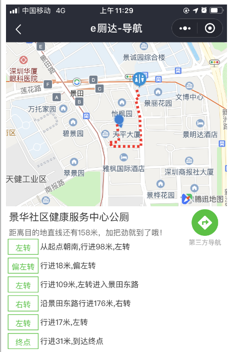 第三個功能為導航找?guī)<热灰呀洸榭吹街苓呌袔植?,怎能不知道具體線路呢?“e廁達”中的“帶我去”按鈕可以輕松引領你去往定位的公廁。