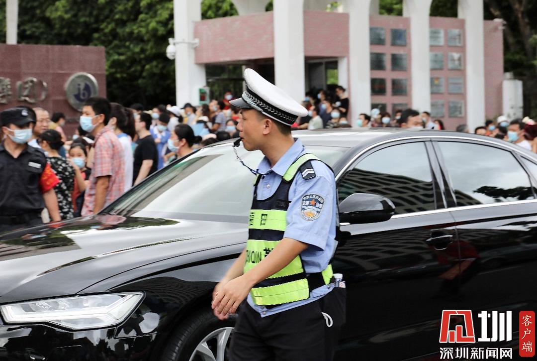 交警在考點(diǎn)外保障路況安全,運(yùn)行通暢。