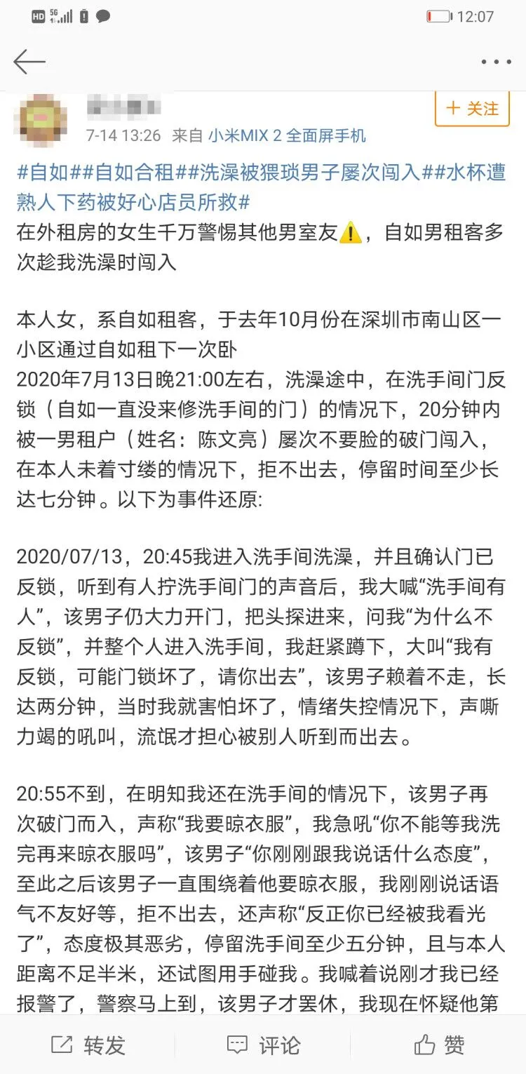 7月14日,梁女士在新浪微博發(fā)帖稱,她是南山某小區(qū)的自如租客,其在7月13日21時(shí)許的洗澡過程中,遭遇男性室友屢次闖入。根據(jù)梁女士描述,該男子態(tài)度惡劣,在梁女士未著寸縷的情況下在浴室停留時(shí)間長達(dá)數(shù)分鐘,其間還試圖伸手觸碰梁女士。梁女士回到房間后,向自如管家進(jìn)行反饋并報(bào)警。