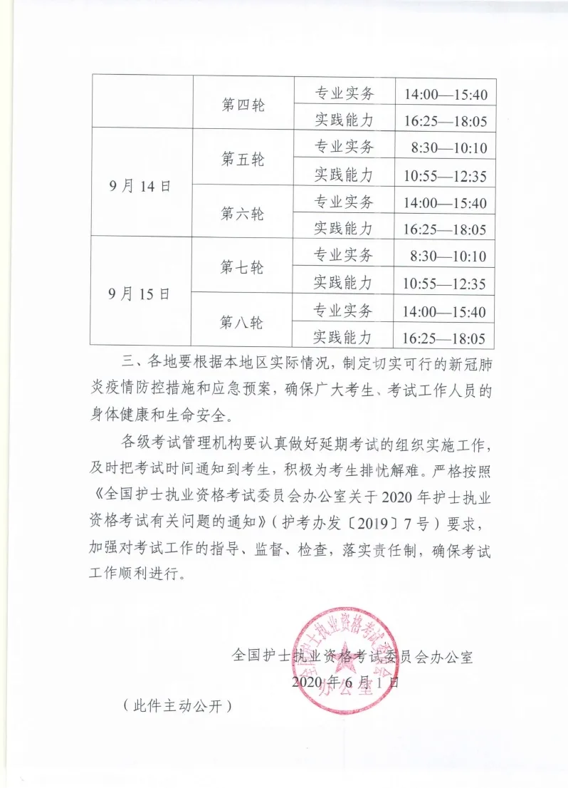 6月1日,全國護(hù)士執(zhí)業(yè)資格考試委員會辦公室印發(fā)《關(guān)于延期舉行2020年護(hù)士執(zhí)業(yè)資格考試的通知》,2020年護(hù)士執(zhí)業(yè)資格考試延期至9月12日—15日舉行。