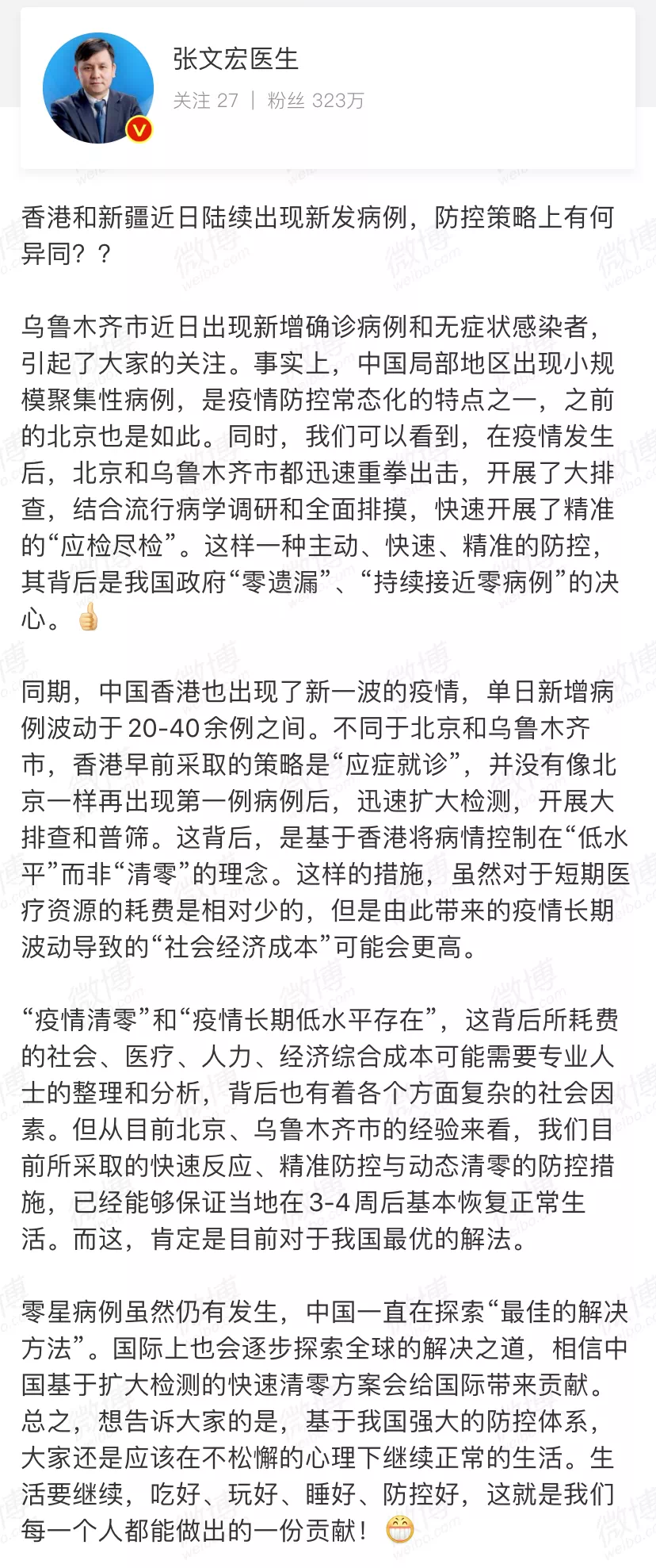 7月18日8時(shí)許,上海復(fù)旦大學(xué)附屬華山醫(yī)院感染科主任@張文宏醫(yī)生在微博上就“香港和新疆近日出現(xiàn)新發(fā)病例”發(fā)聲。