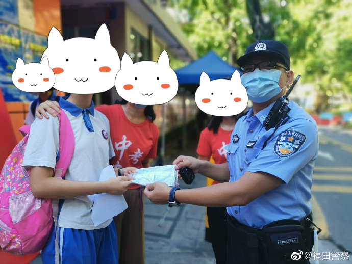 7月21日,深圳中考第二天,景田派出所社區(qū)民警一早就在各考場外為考生們保駕護航。當(dāng)社區(qū)民警趙廣生看見一名忘記佩戴口罩的考生時,立即取出身上的備用口罩遞給她,使得考生順利進入考場參加考試。福田警方溫馨提醒:乘風(fēng)破浪的同時,也要做到考試防疫兩不忘。少年們,下午的考試繼續(xù)加油吧!