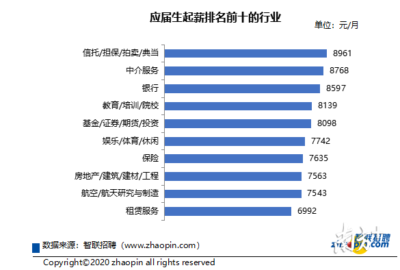 報告顯示,應(yīng)屆生起薪排名前十的行業(yè)中,信托/擔(dān)保/拍賣/典當(dāng)、中介服務(wù)、銀行等行業(yè)為起薪排名前三名,分別為8961元,8768元和8597元。除此之外,教育/培訓(xùn)/院校、娛樂/體育/休閑等受益于直播經(jīng)濟的帶動和數(shù)字化的發(fā)展,也向應(yīng)屆生開出了相對高的薪酬。