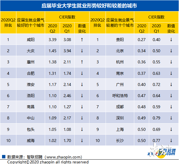 《報告》顯示,二季度應(yīng)屆生CIER指數(shù)較高的城市為二、三線城市,例如,咸陽、大慶、惠州、合肥和淮安等,這些城市的CIER指數(shù)均要高于1。而在應(yīng)屆生就業(yè)景氣較差的城市中,北上廣深等一線城市,以及杭州、南京、成都等新一線城市的應(yīng)屆生CIER指數(shù)相對較低,就業(yè)競爭相對激烈。