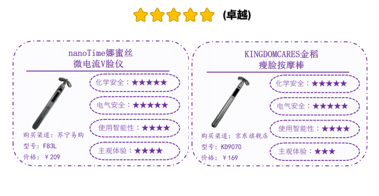 經(jīng)測試,綜合化學(xué)安全、電氣安全、使用智能性、主觀體驗等消費者關(guān)心的多個維度,2款微電流型家用美容儀和1款電離子型美容儀品質(zhì)領(lǐng)跑表現(xiàn)卓越,分別為,國產(chǎn)品牌nanoTime娜蜜絲F83L微電流V臉儀和KINGDOMCARES金稻 KD9070瘦臉按摩棒;日本品牌Panasonic松下 EH-ST50面部護理器(溫熱離子美容儀)。