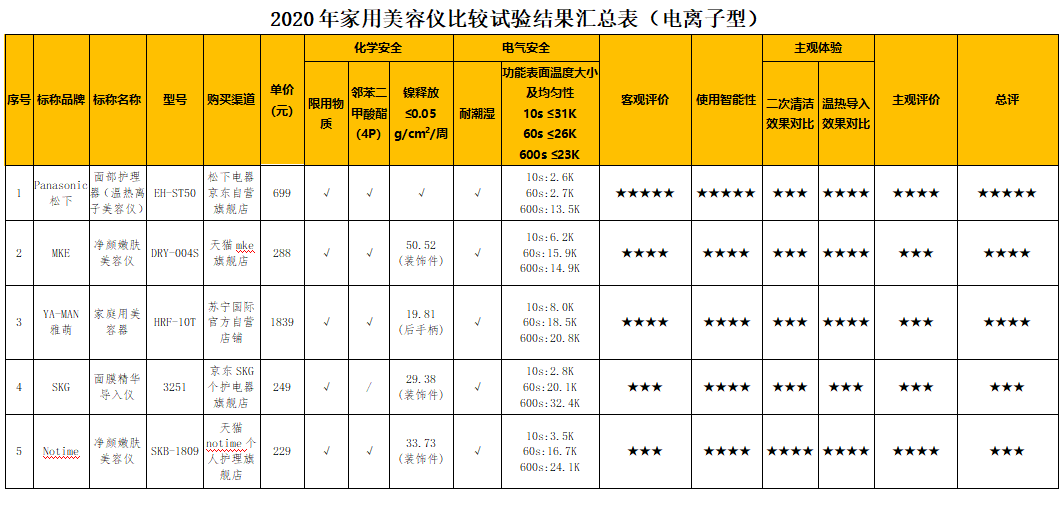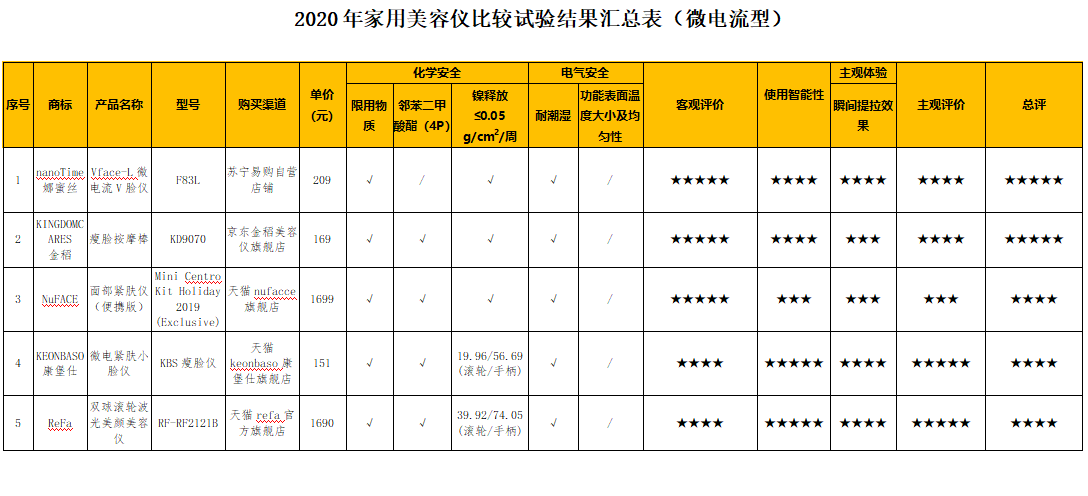 附:2020年家用美容儀比較試驗結(jié)果匯總表(微電流型/電離子型)
