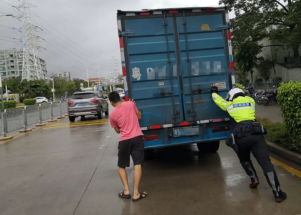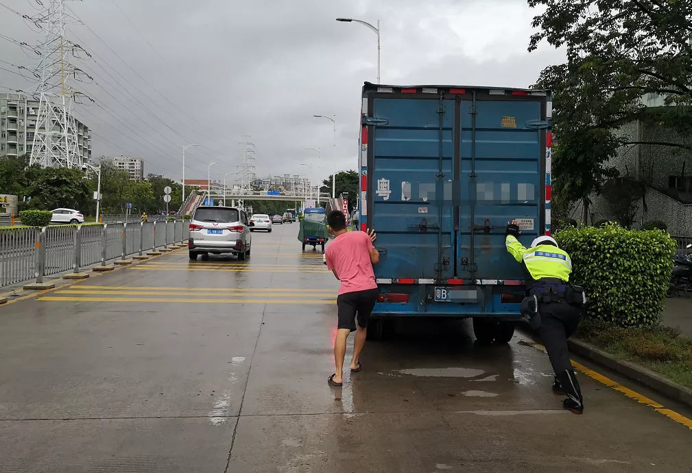 了解情況后,為緩解路面擁堵,避免產(chǎn)生交通事故,鐵騎隊(duì)員協(xié)助司機(jī)把車推到一邊等待救援。