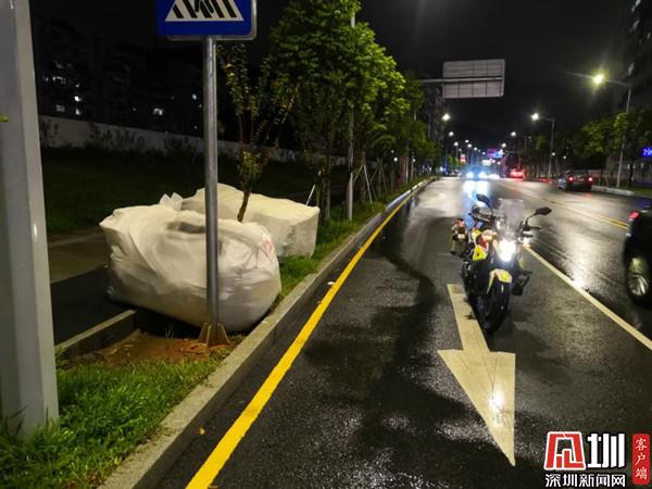 9月18日,羅湖大隊(duì)筍崗中隊(duì)警力馬清田、楊宇翰巡邏至珠嶺路時(shí),發(fā)現(xiàn)一大袋泡沫被遺落在機(jī)動(dòng)車道,馬清田、楊宇翰立即上前將泡沫移至人行道上,保障該路段車輛安全、有序通行。
