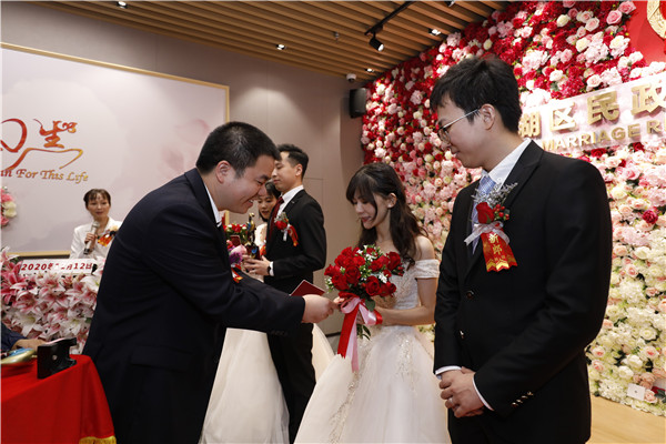 銀婚老人為12對(duì)新人頒發(fā)結(jié)婚證