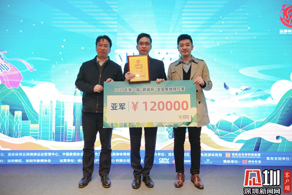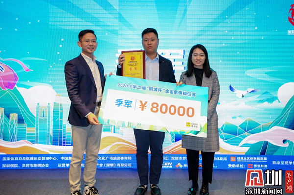 薛江與舒立共同為趙鑫鑫頒發(fā)獎(jiǎng)牌與賽事獎(jiǎng)金。趙鑫鑫在發(fā)表賽后感言時(shí)說道,今年疫情的大背景下賽事少,“鵬城杯”辦得非常好。他也表示,在一年的最后一天下棋對弈非常難得,希望明年再進(jìn)一步。