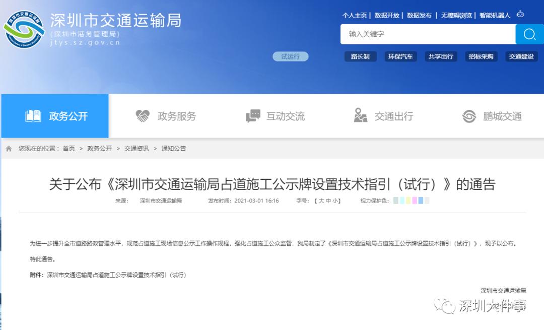 為加強(qiáng)道路管理,規(guī)范道路占用、挖掘行為,強(qiáng)化占道施工公眾監(jiān)督,深圳市交通運輸局編制了《占道施工公示牌設(shè)置技術(shù)指引(試行)》(以下簡稱《指引》),對占道施工公示牌設(shè)置要求,張貼范圍都有了明確的標(biāo)準(zhǔn)和要求。